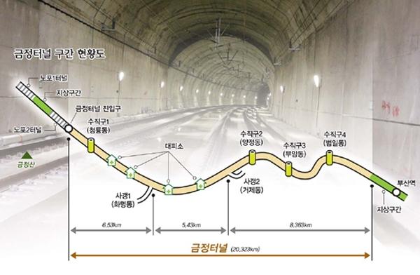 14일 부산시소방본부와 코레일 등에 따르면 금정터널은 부산 금정구 노포동에서 동구 수정동 구간까지 길이 20.3㎞에 이르는 국내 최장 터널로 하루 수십대의 KTX 열차가 지나 다닌다.