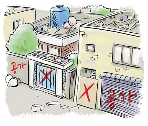 '공가'는 으르고 공갈하는 누군가의 눈초리가 스민 듯하다. 재건축조합원일지라도 많은 추가부담금을 물어야만 아파트 한 칸을 차지할 수 있으니, 그럴 형편이 못 되는 이들에겐 재건축은 으름장과 공갈이나 다름없다. 그들에게 재건축은 내 집을 빼앗기고 변두리로 내몰린다는 뜻이다. 다수들에 의해 울며 겨자 먹는 식으로 합의는 했지만, 내 집을 웃돈 얹어 다시 매입하게 해 놓은 건설사의 셈법을 따져 볼 언턱거리도 없다. 공가 여기저기 붉은색으로 그어진 가위표는 헌 집을 매끈한 새집으로 바꿔주는데 입도 벙긋 말라는 협박 같았다.