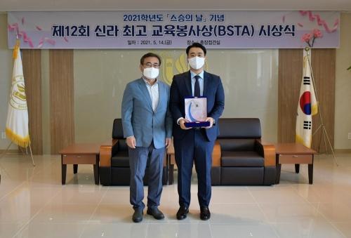 신라대학교(총장 김충석) 경찰행정학과 이상훈(오른쪽) 교수가 스승의 날을 앞둔 지난 14일 2021년 신라 최고 교육봉사상을 받았다.