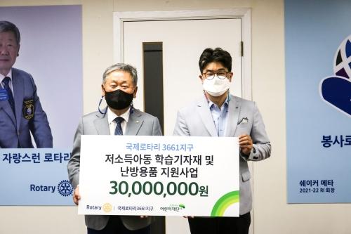 국제로타리 3661지구(총재 주진철·왼쪽)는 지난 24일 초록우산 어린이재단(부산지역본부장 노희헌·오른쪽)에 부산의 저소득계층 아동을 위한 교육 기자재와 난방용품 지원금 3000만 원을 전달했다.