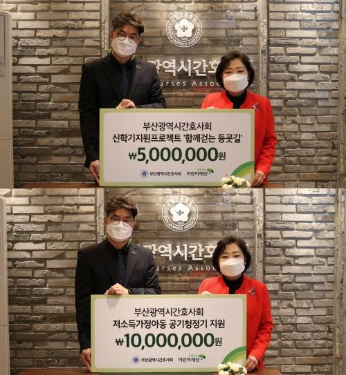 부산시간호사회(회장 황지원·오른쪽)는 최근 제51회 국제간호사회의 날 기념으로 조성한 ‘건강한 숨 쉬기-숨’ 지원금 1000만 원과 저소득가정 신학기 지원금 500만 원 등 총 1500만 원을 초록우산 어린이재단(부산지역본부장 노희헌·왼쪽)에 각각 전달했다.