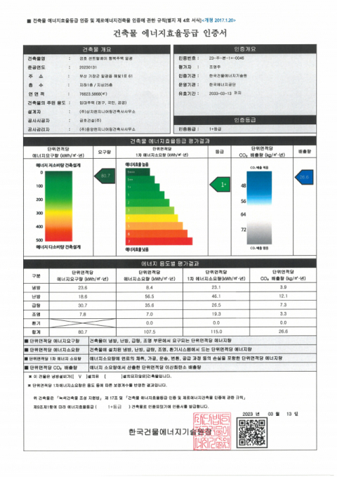 이러한 노력의 결과, 공사는 「녹색건축물 조성 지원법」에 따른 ‘녹색건축(일반등급)’과 「건축물에너지효율등급 인증 및 제로에너지건축물 인증에 관한 규칙」에 따른 ‘에너지효율등급(주거1++, 비주거1+++)’을 획득했다. 특히 에너지효율등급 비주거 부문에서는 예비인증 등급 1++ 대비 향상된 ‘1+++ 등급’을 받아 에너지 성능 강화 노력의 성과를 인정받았다.