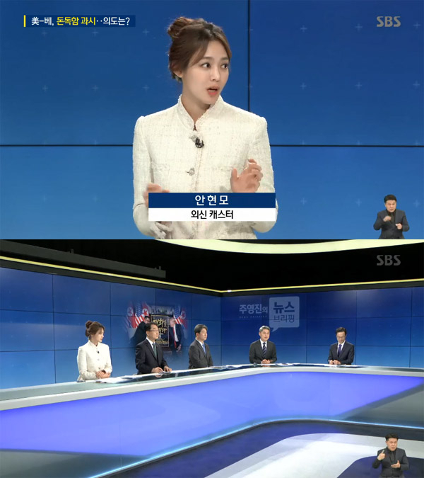 27일 방송된 SBS '주영진의 뉴스브리핑'에서는 안현모가 '외신 캐스터' 역할로 스튜디오에 함께 자리해 전문가 패널들과 '북미 정상회담' 관련 외신 보도를 전했다. 프로그램을 진행하는 주영진 앵커가 이날 낮 트럼프 미국 대통령이 베트남 정부인사들과의 일정을 소화하는 과정을 정리한 뒤, 안현모에게 "트럼프 대통령의 발언이나 북미 정상회담과 관련해 특별한 외신 소식이 있는지"를 물었다.