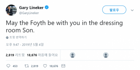 현지 팬들 역시 트위터에서 포이스와 손흥민의 사진을 함께 올리며 "May the Foyth be with you"라고 적는 등 유행어 확산에 동참했다.