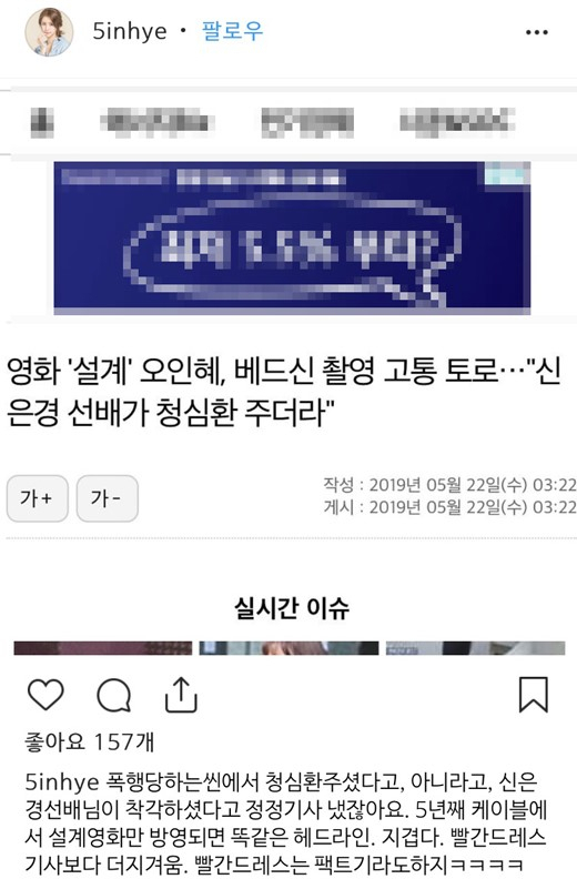 이와 함께 "영화 '설계' 오인혜, 베드신 촬영 고통 토로…'신은경 선배가 청심환 주더라"라는 기사를 캡처했다. 영화 '설계'가 방영되자 과거 에피소드를 기사화 한 것이다.