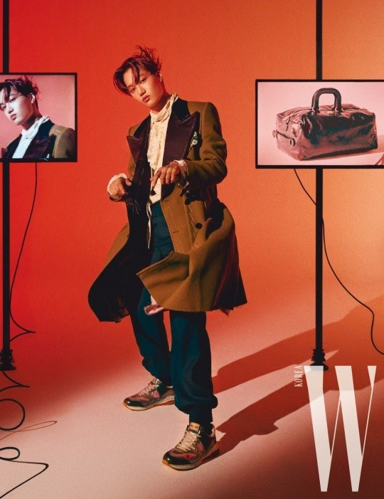 카이는 더블유 맨 커버를 통해 프린트가 돋보이는 마젠타 컬러의 재킷과 그레이 컬러의 빈티지 와이드 팬츠를 입고 매력적인 눈빛을 발사했다.