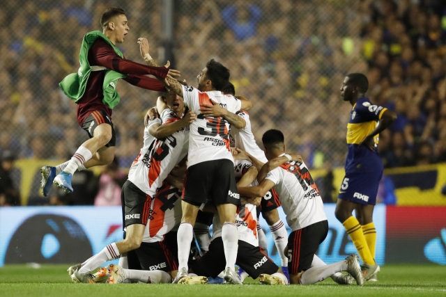 아르헨티나 보카 주니어스와 리버 플레이트 간 맞대결 ‘엘 수페르클라시코’가 세계 최고의 축구 더비 1위에 올랐다. 지난해 10월 코파 리베르타도레스 준결승에서 보카 주니어스를 물리치고 결승에 오른 리버 플레이트 선수들이 환호하는 모습. AP연합뉴스