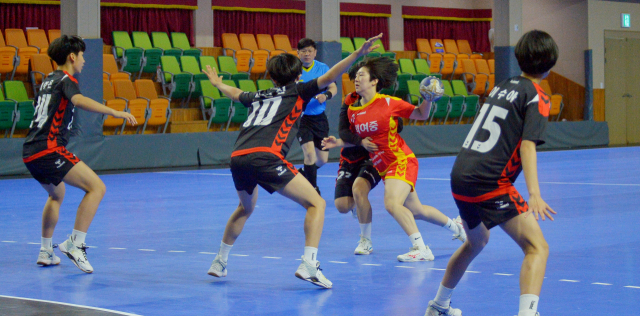 부산일보사와 대한핸드볼협회가 주최하는 ‘2021 대한핸드볼협회장배 전국 중·고등선수권대회’ 나흘째 경기가 25일 경남 고성군에서 개최됐다. 이날 44개 참가팀 가운데 30개 팀이 출전해 기량을 겨뤘다. 인화여중과 맞붙은 양덕여중의 임소의 선수가 공격을 시도하고 있다. 인화여중이 25-19로 승리했다. 박지훈 기자