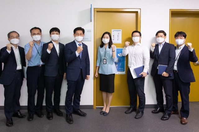 노형욱 국토교통부 장관(왼쪽에서 네 번째)이 13일 오후 국토부에 신설된 청년정책과 사무실을 방문해 직원들과 기념 촬영을 하고 있다. 국토부 제공
