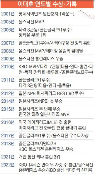 이대호는 KBO 통산(17시즌) △타율 0.309 △안타 2199개 △홈런 374개 △타점 1425점을 남기고 정든 사직야구장을 떠났다.