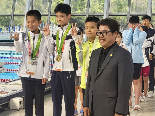 울산에서 열린 제52회 소년체전이 막을 내렸다. 부산선수단에서는 수영 13세 이하부 공건(왼쪽 두 번째) 등 3명의 선수가 2관왕에 올랐다. 부산시체육회 제공
