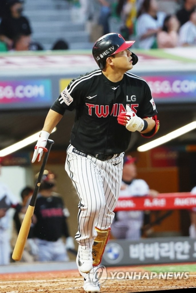 지난해 6월 27일 인천 SSG랜더스필드에서 열린 2023 KBO리그 프로야구 LG 트원스와 SSG 랜더스 경기. 5회초 무사 상황 LG 김민성이 솔로 홈런을 치고 있다. 연합뉴스 제공