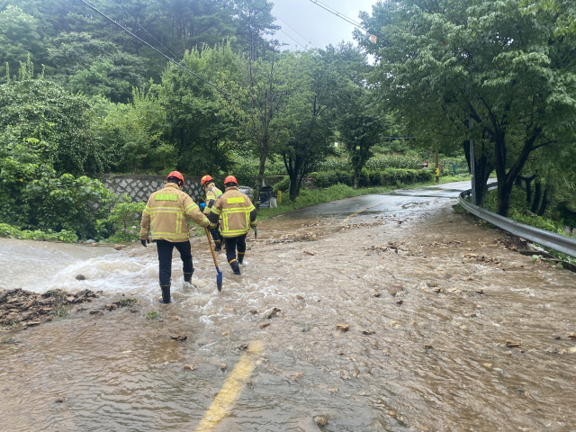 장마전선의 영향으로 밤사이 굵은 빗줄기가 쏟아진 경남에 피해가 잇따랐다. 14일 오전 7시 39분엔 거제시 일운면 한 도로에 자그마한 돌멩이 여러 개가 떨어져 소방대원들이 안전조치하고 있다. 경남소방본부 제공