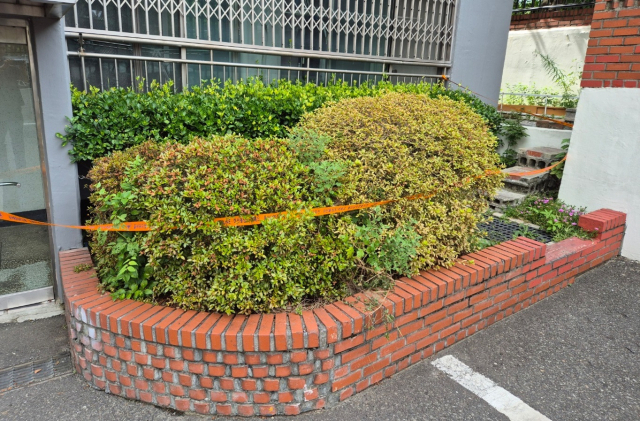 현금다발 7500만 원이 발견된 울산의 한 아파트 화단. 경찰은 현장 주변에 폴리스라인을 설치하고 주변 CCTV를 확보해 돈의 출처를 캐는 데 주력하고 있다. 권승혁 기자