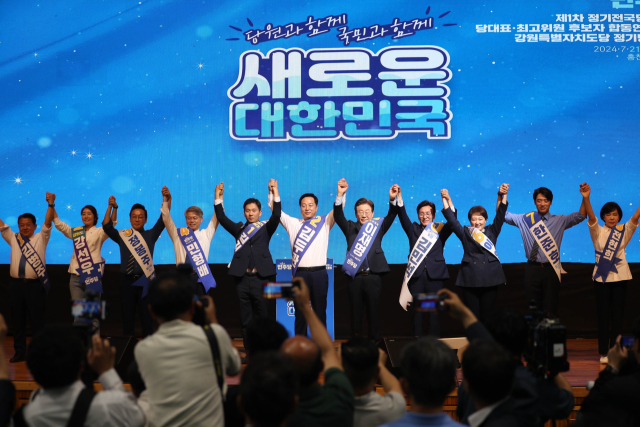 더불어민주당 전당대회와 관련 ‘당심’과 ‘민심’의 격차에 대한 우려가 커지고 있다. 사진은 지난 21일 강원 홍천군 홍천종합체육관에서 열린 민주당 합동연설회 모습. 연합뉴스