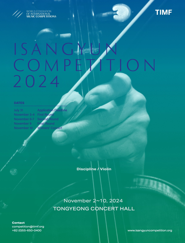 2024 윤이상국제음악콩쿠르 참가자 접수가 공식 홈페이지(www.isangyuncompetition.org)에서 진행 중이다. 올해 콩쿠르는 바이올린 부문으로 진행되며, 1994년 11월 1일부터 2009년 10월 31일 사이에 출생한 자는 국적과 관계없이 누구나 지원할 수 있다. 지원 마감은 오는 31일까지이며, 본선 진출자는 8월 30일 발표된다. 경연은 11월 2~10일 진행된다. 과제곡과 제출 서류 등 자세한 내용은 공식 홈페이지에서 확인할 수 있다.
