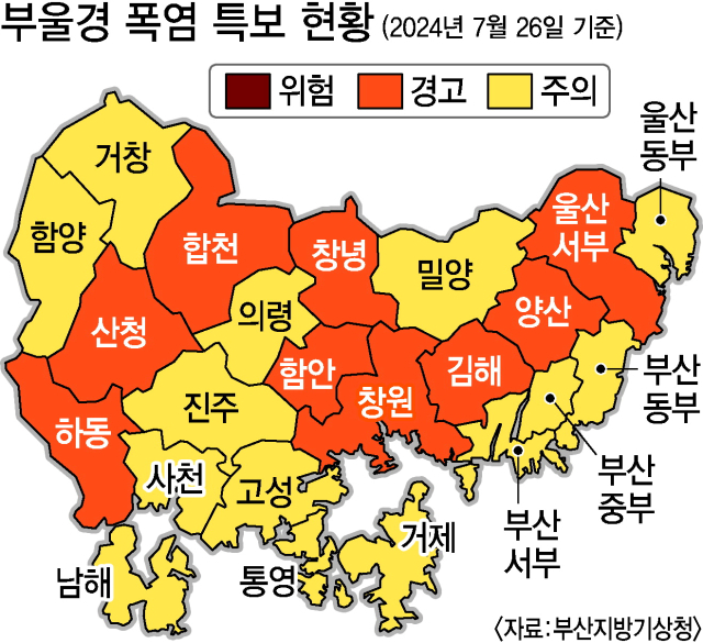25일 부산지방기상청에 따르면 26일 기준 부산과 울산 동부, 경남 밀양·의령·진주·함양·거창·통영·사천·거제·고성·남해에 폭염 주의보가, 울산 서부와 경남 양산·창원·김해·함안·창녕·하동·산청·합천에 폭염 경보가 내려졌다. 폭염 주의보와 폭염 경보는 각각 낮 최고 체감온도가 33도 이상, 35도 이상이 2일 이상 이어질 것으로 예상될 때 발효된다. 지난 23일 기준 부울경 온열질환자도 104명으로 늘었다.