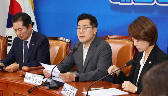 더불어민주당 박찬대 당대표 직무대행 겸 원내대표(가운데)가 9일 오전 국회에서 열린 최고위원회의에서 발언하고 있다. 연합뉴스