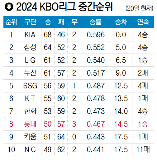 롯데·한화·KT, 역대급 5위 싸움… NC는 11연패 ‘꼴찌’