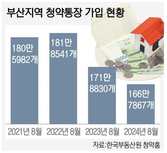1일 한국부동산원 청약홈에 따르면 지난 8월 말 기준 부산지역 청약통장 계좌는 166만 7867개로 집계됐다. 이는 지난해 8월(171만 8830개)과 비교할 때 5만 963개나 줄어든 수치다. 2022년 8월 부산의 청약통장 계좌는 181만 8541개로 2년 만에 15만 개 이상 통장 갯수가 감소했다.