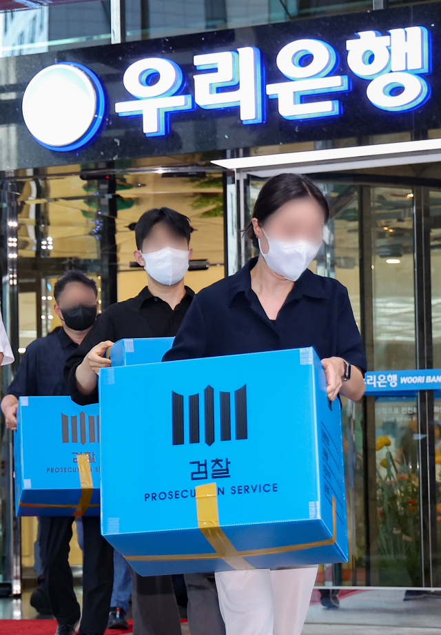 우리은행에서 또 한 번 대규모 금융사고가 발생했다. 손태승 전 우리금융지주 회장 친인척에 대한 부당대출 의혹을 수사 중인 검찰이 우리은행 본점 등 사무실 압수수색에 나선 가운데 지난달 27일 서울 중구 우리은행 본점에서 검찰 관계자들이 압수품 박스를 들고 나서고 있다. 연합뉴스