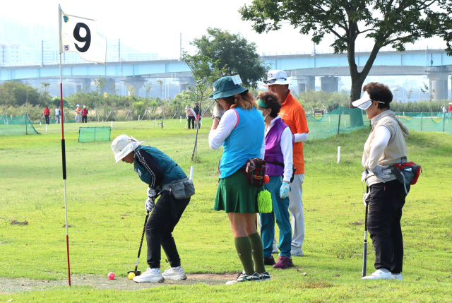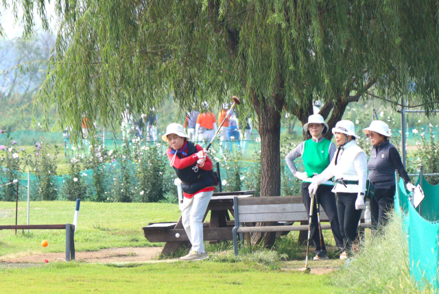 지난달 부산 강서구 대저생태공원 파크골프장에서 열린 새마을금고배 대회에 출전한 동호인들이 경기를 펼치고 있다. 남태우 기자