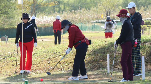 파크골프 동호인들이 30일 제11회 부산시장배 파크골프 대회에서 경쟁을 벌이고 있다. 남태우 기자