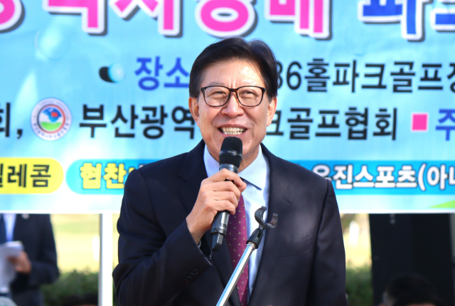 박형준 부산시장이 30일 제11회 부산시장배 파크골프대회 개막식에서 인사말을 하고 있다. 남태우 기자