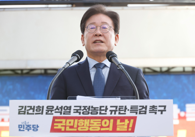 더불어민주당 이재명 대표가 2일 서울 중구 서울역 일대에서 더불어민주당 주최로 열린 김건희 윤석열 국정농단 규탄·특검 촉구 국민행동의날에서 발언하고 있다. 연합뉴스