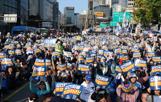2일 서울 중구 서울역 일대에서 더불어민주당 주최로 열린 김건희 윤석열 국정농단 규탄·특검 촉구 국민행동의날에서 참가자들이 '김건희를 특검하라!' 손팻말을 들어보이며 구호를 외치고 있다. 연합뉴스
