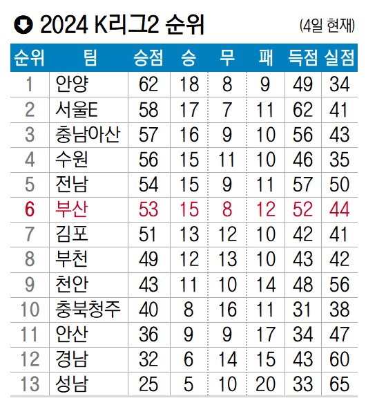 부산은 오는 9일 오후 부산 구덕운동장에서 부천FC1995와 39라운드 홈 경기를 치른다. 이날 부산과 부천의 맞대결은 두 팀 모두에게 올 정규 시즌 마지막 경기다. 또 경기 결과에 따라 부산의 1부 리그 승격을 위한 준PO 참가 여부가 결정된다. 현재 부산은 승점 53점으로 6위를 달리고 있다. K리그2 13개 구단 중 모든 경기를 소화한 팀은 4위(승점 56점)에 오른 수원 삼성블루윙즈다.