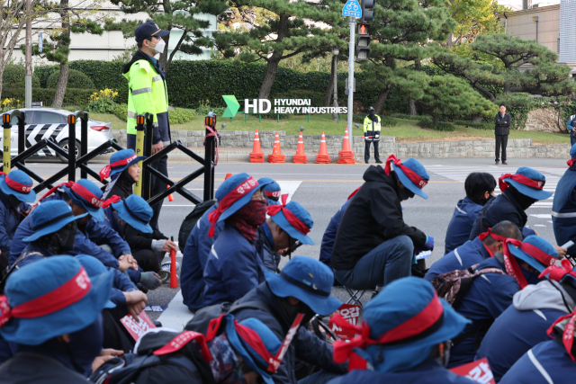 5일 오후 울산 동구 HD현대중공업 정문 앞에서 HD현대중공업 규탄 결의대회가 열리고 있다. 연합뉴스