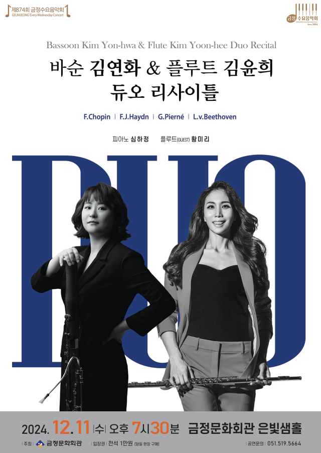 제875회 금정수요음악회는 바수니스트 김연화(뉴월드필하모닉 오케스트라 수석)와 플루티스트 김윤희 듀오 리사이틀로 열린다. 연주곡은 쇼팽 ‘로시니에 의한 변주곡’, 하이든의 두 대의 플루트와 바순을 위한 런던 트리오 1번 다장조, 가브리엘 피에르네 바순을 위한 솔로 콘체르토 작품번호 35, 베토벤의 플루트, 바순 그리고 피아노를 위한 트리오 작품번호 37 등이다. ▶12월 11일(수) 오후 7시 30분 금정문화회관 은빛샘홀. 입장료 1만 원.