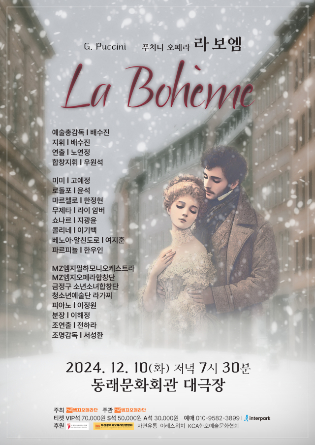 푸치니 서거 100주년을 기념해 MZ엠지오페라단이 주최·주관하는 오페라 ‘라 보엠’ 전막 공연. ‘라 보엠’은 겨울 크리스마스 시즌을 배경으로 하는 만큼 겨울에 많이 공연되는 편이다. 젊은 보헤미안들의 사랑과 이별 그리고 애환을 그린다. 출연진 지휘 배수진(MZ엠지오페라단 단장), 연출 노연정, 합창지휘 우원석(금정구 소년소녀합창단 지휘자), 미미 역 소프라노 고예정, 로돌포 역 테너 윤석, 마르첼로 바리톤 한정현, 무제타 소프라노 암버 라이, 쇼나르 바리톤 서진원, 콜리네 베이스 바리톤 이기백, 베누아·알친도로 바리톤 여지훈, 파르피뇰 테너 한우인, 피아노 이정원, MZ엠지필하모니오케스트라, MZ엠지오페라합창단, 금정구소년소녀합창단. ▶12월 10일(화) 오후 7시 30분 동래문화회관 대극장. 티켓 VIP석 7만 원, S석 5만 원, A석 3만 원.