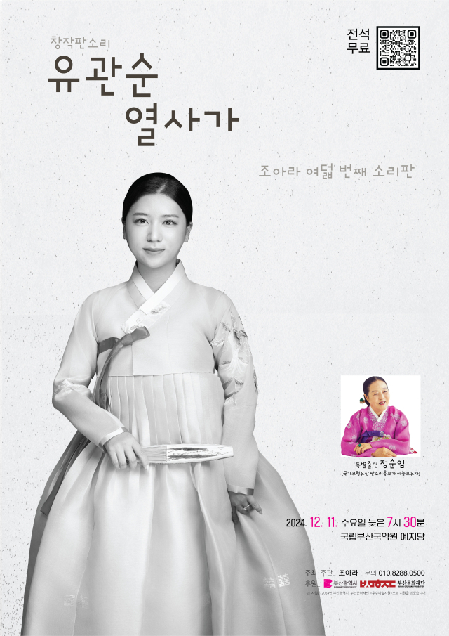 소리꾼 조아라가 선보이는 창작 판소리 ‘유관순 열사가’ 완창 무대. 유관순의 짧지만 강렬했던 생애, 독립운동, 애국혼 등을 생생하게 담아낸 ‘유관순 열사가’를 바탕으로 피아노와 판소리의 협업으로 선보인다. ‘열사가’는 이준, 윤봉길, 안중근, 유관순 등 항일투쟁 영웅들의 전기적 사실을 엮은 것으로 현대 창작 판소리의 효시가 되는 작품이다. 특히 ‘유관순 열사가’는 완창에 걸리는 시간이 약 70분으로 열사가 중 가장 긴소리이다. 조아라는 국가무형유산 판소리 흥보가 보유자인 정순임 명창에게 ‘유관순 열사가’를 사사했다. 정순임 명창이 특별 출연한다. ▶12월 11일(수) 오후 7시 30분 국립부산국악원 예지당. 전석 무료.