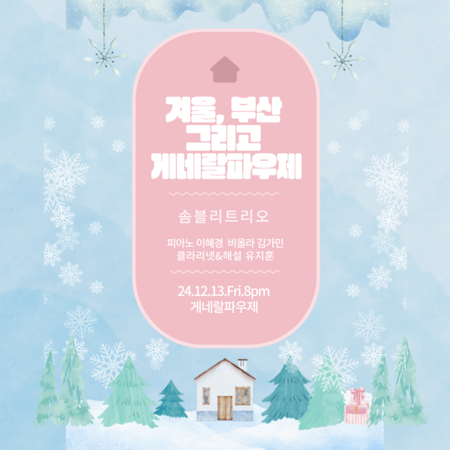솜블리 트리오가 게네랄파우제에서 마지막으로 선보이는 공연. 계절의 변화를 느낄 수 있는 곡으로 구성한다. 쇼스타코비치 5개의 소품, 김효근 ‘눈’ ‘시간에 기대어’ ‘감사’ 등을 연주한다. 출연 피아노 이혜경, 비올라 김가민, 클라리넷 유지훈. ▶12월 13일(금) 오후 8시 부산 중구 광복로49번길 31, 2층 게네랄파우제. 입장료 2만 원.
