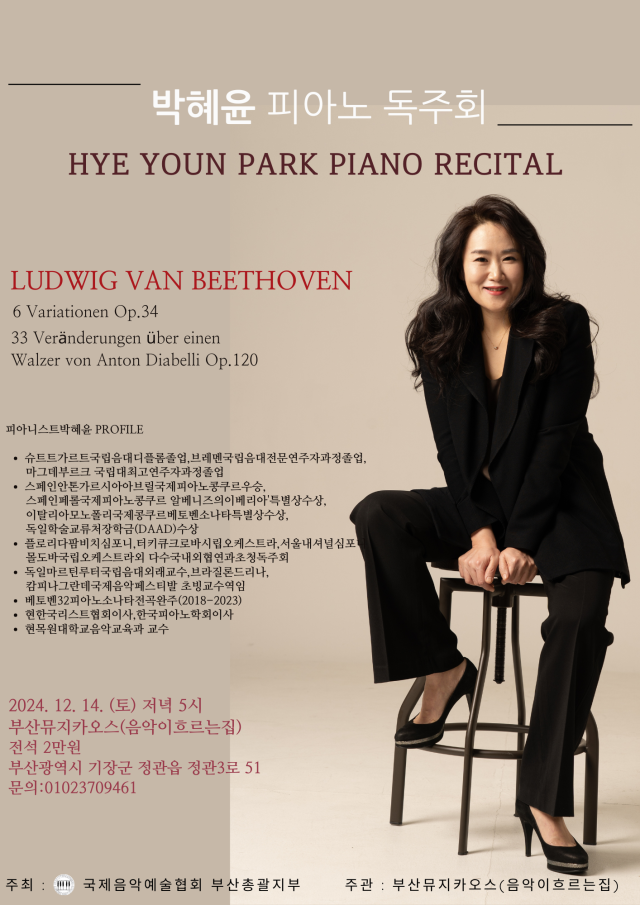 목원대 음악교육과 교수로 재직하는 피아니스트 박혜윤의 독주회. 박혜윤은 2018년 베토벤 피아노 소나타 전곡 시리즈 연주를 시작해 2023년 11월 8번째 무대로 대장정의 막을 내렸다. 이번 무대에서는 베토벤 6개의 변주곡 작품 34, 디아벨리 변주곡 작품 120을 들려준다. ▶12월 14일(토) 오후 5시 부산 기장군 정관읍 정관3로 51동 단지 내 부산뮤지카오스(음악이흐르는집). 전석 2만 원.