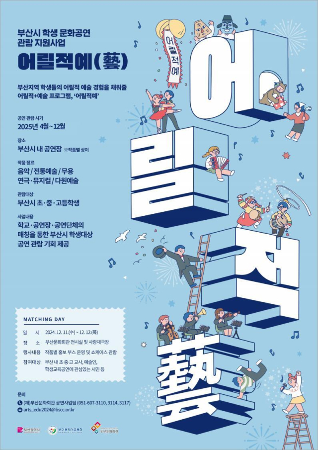 부산시·부산시교육청·(재)부산문화회관 학생문화공연 관람 지원 사업인 ‘어릴적예(藝)’에 참여할 총 34개 작품을 선보이는 오프라인 매칭데이. 음악(8개), 전통예술(7개), 무용(2개), 연극·뮤지컬(13개), 다원예술(4개) 등 장르별로 고루 포함됐다. 학생 맞춤형 공연 베스트 10은 △그루잠프로덕션 ‘스냅(SNAP)’ △극단 배우, 관객 그리고 공간 ‘안네 프랑크’ △김옥련발레단 발레컬 ‘운수 좋은 날’ △드림문화오페라&오케스트라 ‘청소년을 위한 힐링콘서트’ △부산가야금거문고앙상블-해설과 함께하는 우리 음악 이야기 ‘別曲’ △브이브라스 ‘브이브라스와 금관악기에 빠지다!’ △얼터너티브 국악그룹 초아 ‘국악으로 떠나는 세계 여행’ △예술집단 하우 ‘토장군을 찾아라!’ △Project_本(프로젝트_본) ‘알.빠.공Ⅰ흥부전’(알고 들으면 빠져드는 우리 음악 공연) △TDC앙상블 ‘Fantasy: 클래식으로의 여정’이 선정됐다. 이번 사업에 선정된 공연 단체와 작품은 부산시 권역별 공연장에 배치돼 2025년부터 학생들이 공연을 관람할 수 있도록 할 예정이다. ▶12월 11일(수)~12일(목) 오후 2~6시 부산문화회관 전시실 및 사랑채극장. 무료입장.