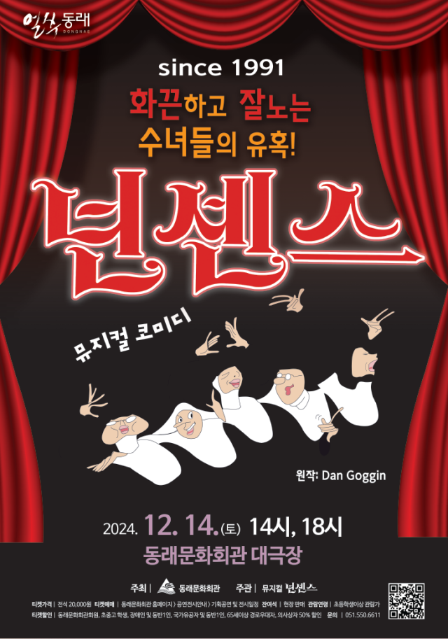 30여 년간 최대 관객 동원, 최다 공연 기록의 최장수 뮤지컬 대기록을 세운 뮤지컬 ‘넌센스’ 부산 공연. 동래문화회관이 주최하고, ㈜뮤지컬넌센스가 주관한다. 못 말리는 다섯 수녀의 버라이어티 쇼가 펼쳐진다. 배경은 미국 뉴저지 호보켄 성헬렌학교. 조용했던 이곳에서 떠들썩한 사건이 터진다. 요리사 줄리아 수녀가 만든 야채수프를 먹고 무려 52명의 수녀가 식중독 증상으로 죽어버린 것. 다행히도 몇 명의 수녀는 외출 중이라 목숨을 건지게 되고, 이들의 장례 비용을 모으기 위한 사투가 시작된다. 출연 민시양, 권보미, 박보영, 진재원, 고샛별. ▶12월 14일(토) 오후 2시·6시 동래문화회관 대극장. 초등학생 이상 관람. 전석 2만 원(잔여석 현장 판매).