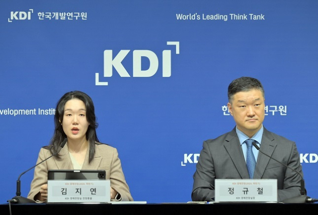 12일 정부세종청사 기획재정부 브리핑실에서 김지연 KDI 전망총괄(왼쪽)과 정규철 KDI 경제전망실장이 브리핑을 하고 있다. KDI 제공