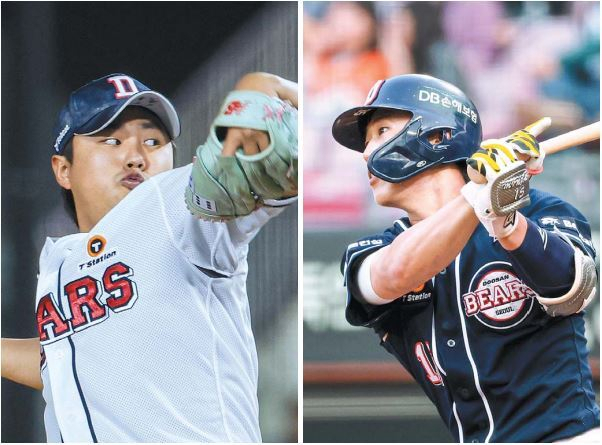 롯데가 불펜과 내야 보강을 위해 두산에서 트레이드 한 투수 정철원(왼쪽)과 내야수 전민재. 연합뉴스