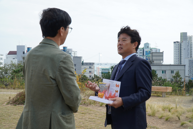 부산 수영구 남천동 옛 부산시장 관사였던 ‘도모헌’ 정원에서 이샘병원 이성근(오른쪽) 병원장이 갑상선 결절의 치료법에 대해 설명하고 있다. 부산 수영구 남천동 옛 부산시장 관사였던 ‘도모헌’ 정원에서 이샘병원 이성근(오른쪽) 병원장이 갑상선 결절의 치료법에 대해 설명하고 있다.