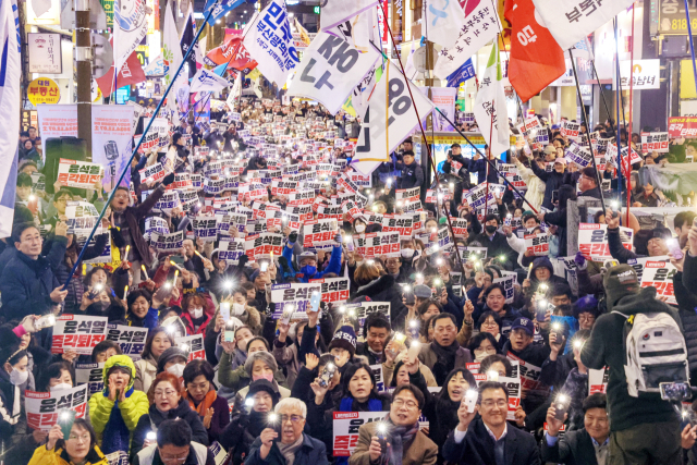 4일 오후 8시 부산 서면 쥬디스태화 일원에서 열린 '윤석열 대통령 퇴진 부산 시민대회'에서 시민사회단체 회원 등이 대통령 퇴진을 요구하며 구호를 외치고 있다. 김종진 기자 kjj1761@ 4일 오후 8시 부산 서면 쥬디스태화 일원에서 열린 '윤석열 대통령 퇴진 부산 시민대회'에서 시민사회단체 회원 등이 대통령 퇴진을 요구하며 구호를 외치고 있다. 김종진 기자 kjj1761@