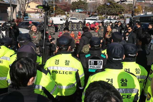 해병대 예비역연대 관계자들이 지난 5일 서울 용산구 대통령실 인근에서 ‘국헌문란 내란수괴 윤석열을 참수하라’ 기자회견을 마친 뒤 대통령실 방향 도로에서 경찰과 대치하고 있다. 연합뉴스