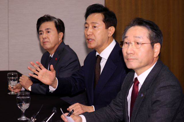 오세훈 서울시장(가운데)과 유정복 인천시장, 김태흠 충남지사가 6일 오후 서울 중구 프레스센터에서 열린 국민의힘 시·도지사협의회 긴급 회의에 참석해 있다. 연합뉴스