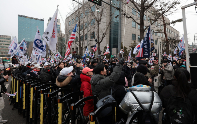 16일 윤석열 대통령 체포적부심사가 열린 서울 서초구 중앙지방법원 앞에서 윤 대통령 지지자들이 태극기를 흔들고 있는 모습. 연합뉴스