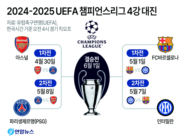 아스널과 PSG의 1차전은 오는 30일, 2차전은 다음 달 8일 개최되고, 바르셀로나와 인터 밀란은 다음 달 1일과 7일 결승 진출을 놓고 맞붙는다.