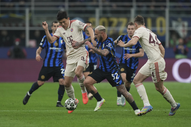 바이에른 뮌헨의 김민재(왼쪽)가 17일 이탈리아 밀라노의 주세페 메아차에서 열린 인터 밀란과의 UCL 8강 2차전 원정 경기에서 상대 공격을 막아내고 있다. AP연합뉴스