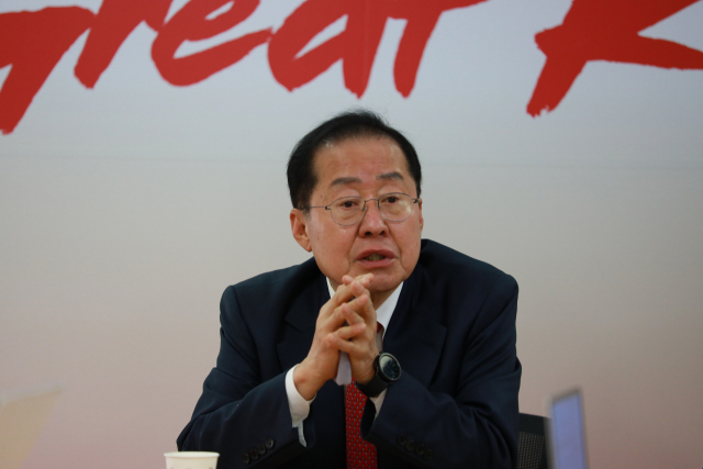 홍 전 시장은 이날 본격적인 레이스에 돌입한 당 대선후보 경선 판세와 관련, “이번 주말이면 대략적인 결론이 날 것”이라고 말했다. 이날 발표된 한 여론조사에서 자신이 처음으로 당 경선 주자 중 ‘대통령 후보 적합도 1위’를 차지한 데 대한 자신감의 표현이었다. 그러면서 ‘최대 변수’로 떠오른 한덕수 대통령 권한대행의 출마에 대해 “모략가나 훼방 군자들이 하는 일”이라며 “상관하지 않겠다”고 잘랐다. 그는 보수 진영의 화두인 ‘반명(반이재명) 빅텐트’와 관련, 단일화 경선 방식이 아닌 국민의힘 후보를 중심으로 한 단일화라는 점을 분명히 하면서 그 실현 방안에 대해서는 “여러 방법이 있고, 본선에서 밝힐 것”이라고만 답했다. 앞서 그는 빅텐트와 관련, ‘연정’을 언급한 바 있다. 다음은 홍 전 시장과의 일문일답.