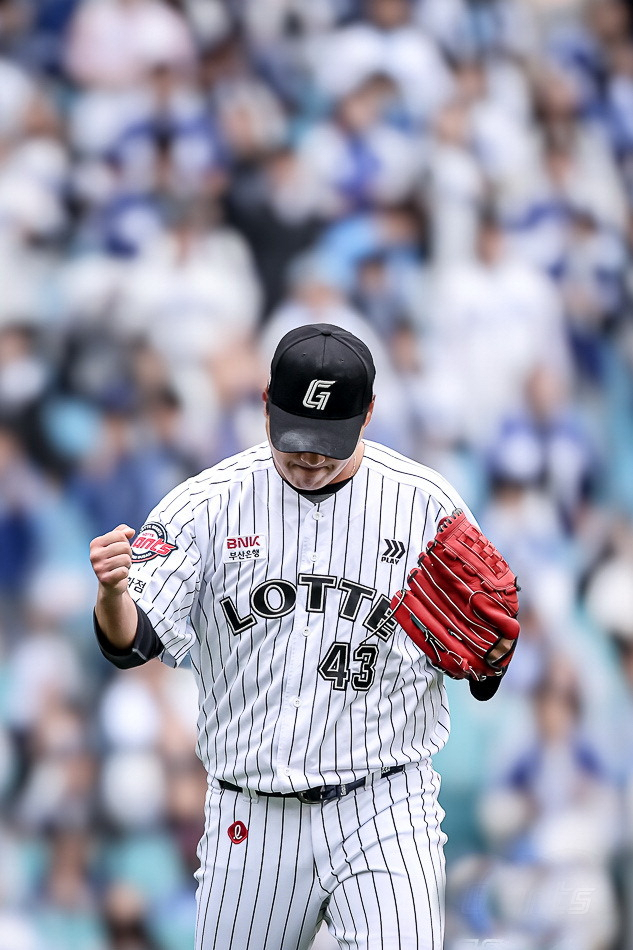 롯데 투수 나균안이 20일 삼성전에서 위기를 넘긴 뒤 주먹을 쥐고 있다. 롯데 자이언츠 제공